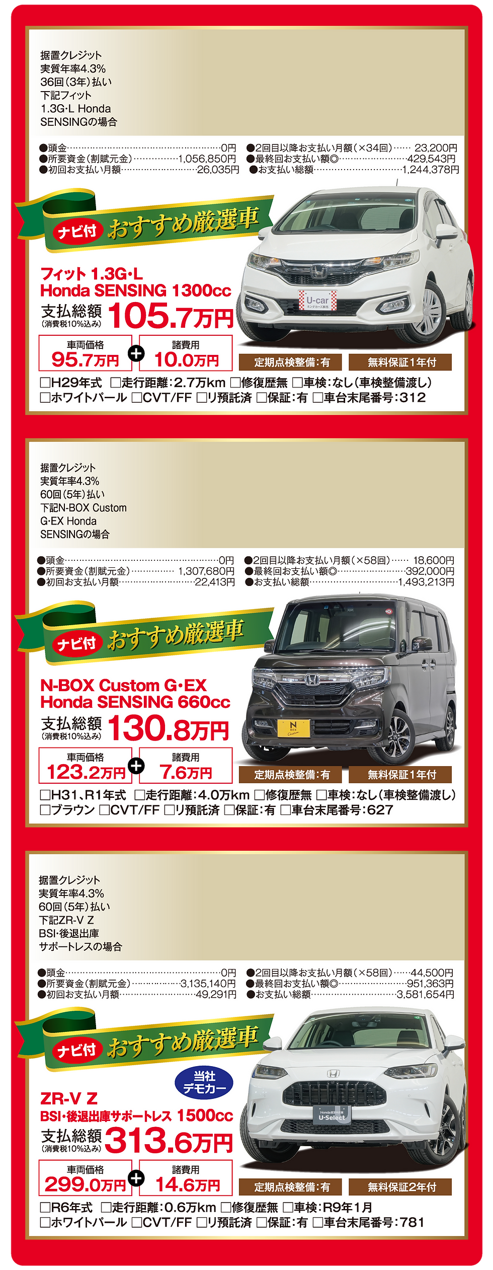 中古車について】■現車は店頭にて十分ご確認の上、ご検討ください。記載の情報は2024年12月20日現在です。売約済みの際はご容赦ください。■車両価格は消費税率10%を含む店頭渡現金価格です。■支払総額には、車両価格の他、保険料、税金、登録等に伴う費用、リサイクル預託金相当額等、購入時に必要な全ての費用が含まれています。■支払総額は、12月現在県内登録(届出)で店頭納車の場合の価格です。■お客様の要望に基づくオプション等の費用は別途申し受けます。■ETC車載器を使用するには別途決済用のETCカード、セットアップ作業(セットアップ費用)が必要となります。■車検整備付とは現在車検有効期間が切れている状態です。納車までに車検と法定24ヶ月定期点検整備を実施しますが、その費用は支払総額に含まれています。■納車時に定期点検整備(法定定期点検整備)を実施いたします。費用は支払総額に含まれます。■リ済込とは、リサイクル料金は預託済みで、預託金相当額が支払総額に含まれています。